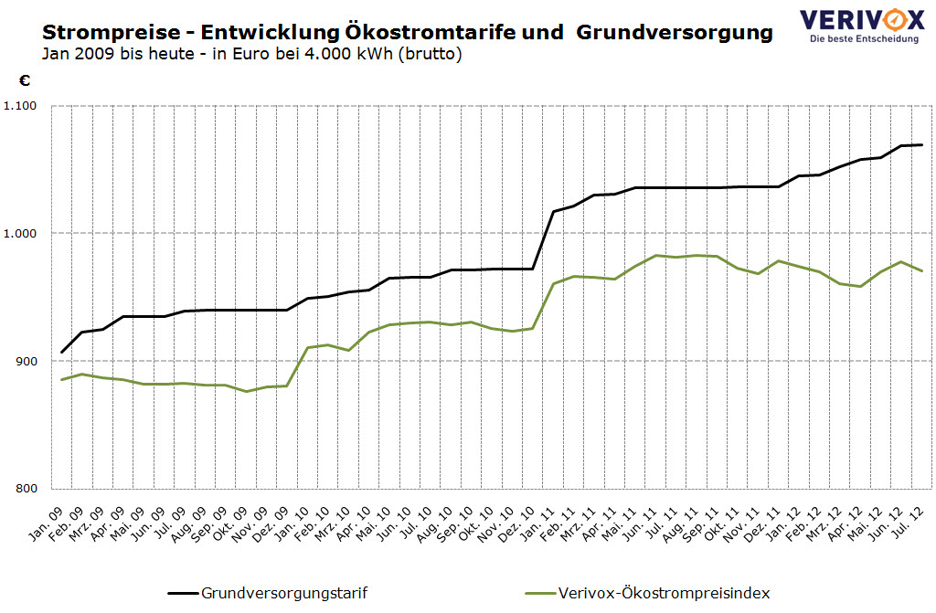 Der Verivox-Ökostrompreisindex weist im Juli 2012 einen Kilowattstundenpreis von durchschnittlich 24,3 Cent aus. Bei einem Vier-Personen-Haushalt mit einem Verbrauch von 4.000 kWh pro Jahr kommen so jährliche Stromkosten von 970 Euro zusammen.